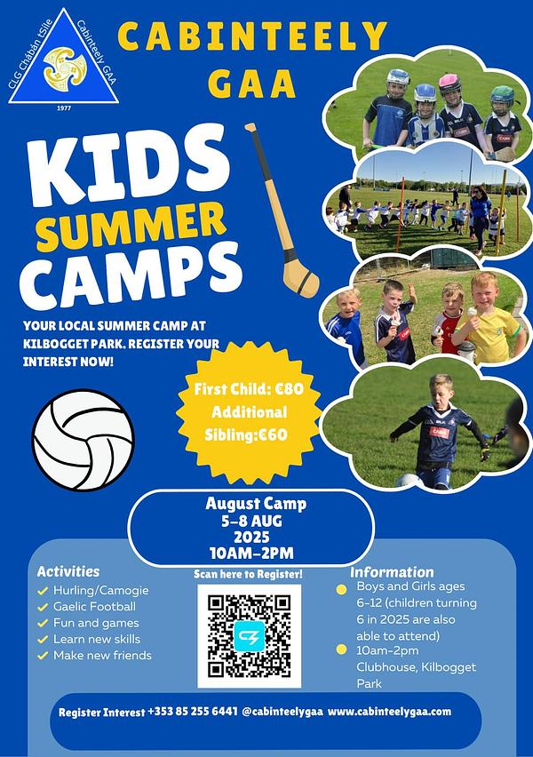 We’re delighted to announce our Cabinteely GAA Summer Camp, running August 5th–8th (10AM–2PM daily) at Kilbogget Park.